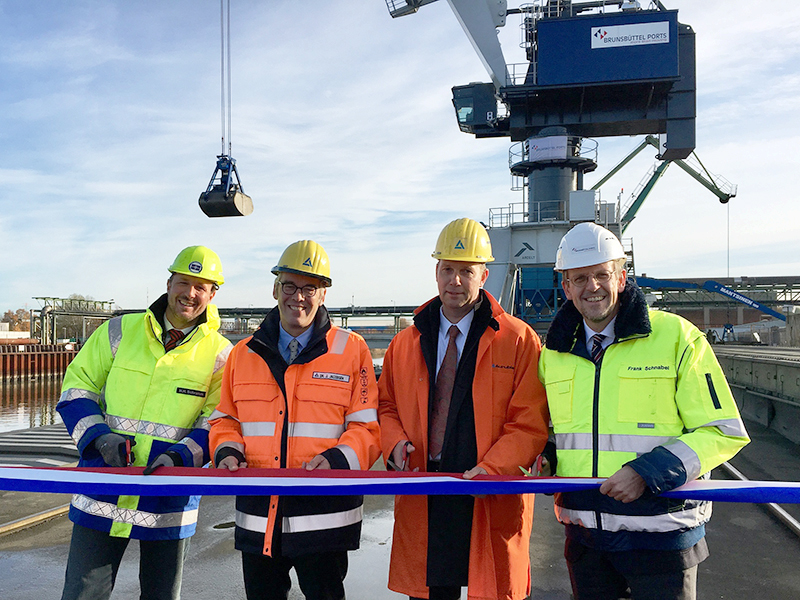 „Ein klares Bekenntnis zum Standort Hamburg“, so bezeichnet Frank Schnabel, Geschäftsführer der Brunsbüttel Ports GmbH und der SCHRAMM group, die getätigte Investition von rund 3 Mio. Euro in den nagelneuen Doppellenker-Wippdrehkran mit Trichter, der heute eingeweiht wurde. Ab sofort wird der Kran auf dem Betriebsgelände der Aurubis AG am Müggenburger Hauptdeich für einen noch effizienteren und zuverlässigeren Umschlag von Kupfererzkonzentrat sorgen.